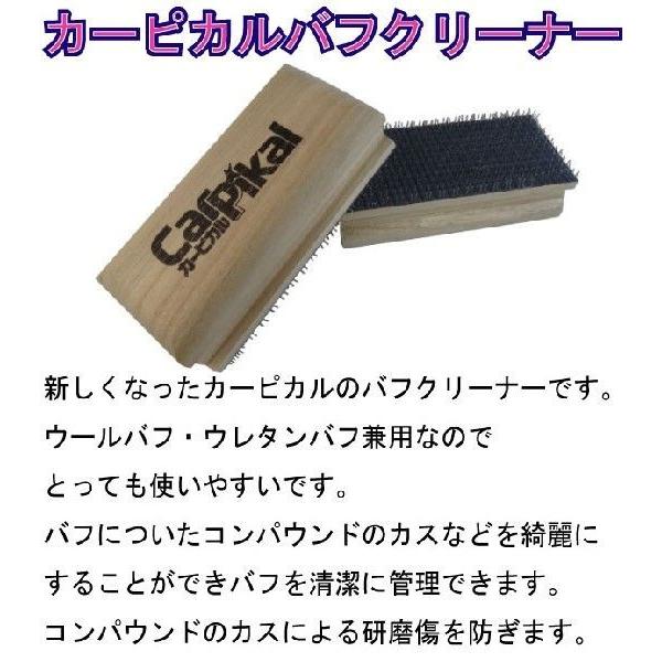 ■バフクリーナー ●サイズ 60mm × 130mm × 42mm 毛足6mm ◎ 握りやすい形状の木柄が付いたバフクリーナーです。 バフ表面の焼付いたコンパウンド等をブラシで簡単に除去出来ます。 |