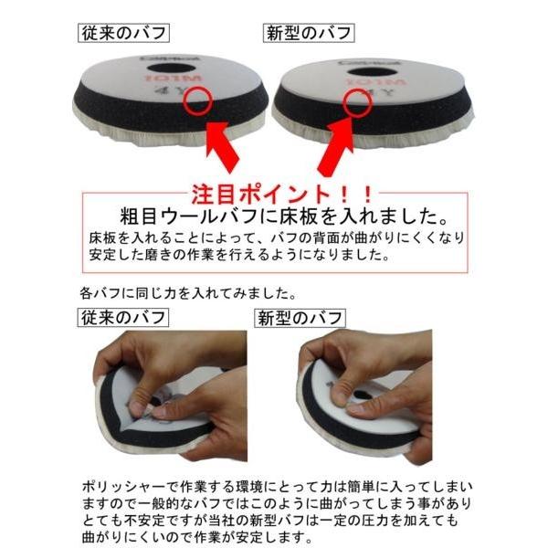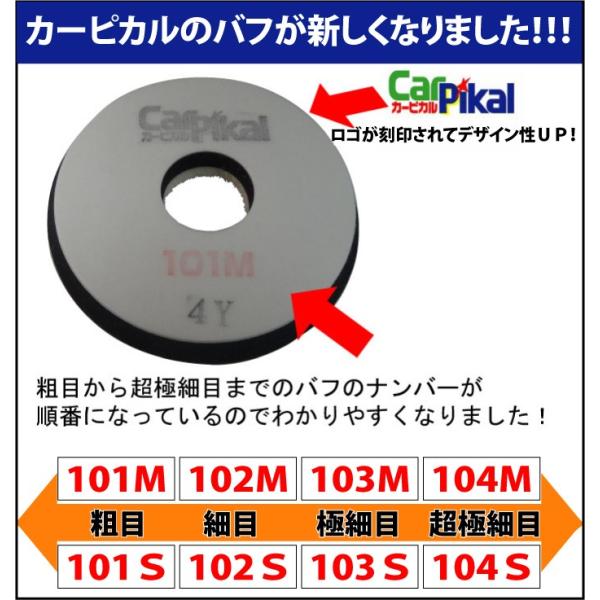 ■極細目ウレタンバフ ●サイズ 外径165mmФ 穴径30mmФ 厚さ30mm ◎ 極細目ウレタンバフは、研磨から仕上げまでコンパウンドやポリッシャーの組み合わせによって幅広く使用できる大変使い勝手の良いバフです。 コンパウンド#2000番と組み合わせる事により、頑固な水垢や極細い線傷などの処理に、コンパウンド#4000番と組み合わせる事により、濃色車のバフ目の処理や仕上げに使用出来ます。 |