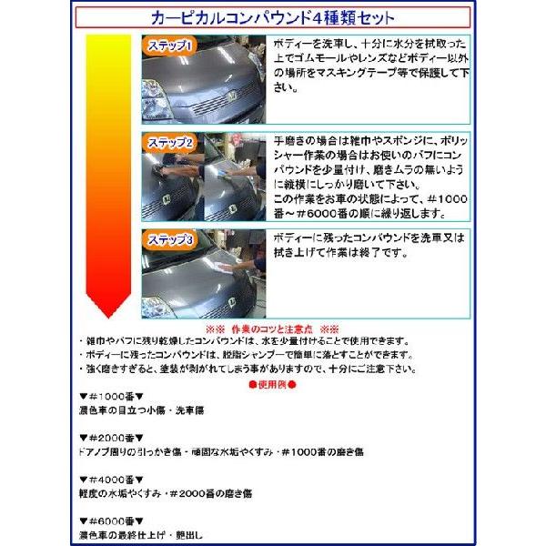 - コンパウンドは基本的に目の粗い順(#1000→#2000→#4000→#6000)にご使用下さい。尚、ボディーの色や傷の状態によって使い分けてください。