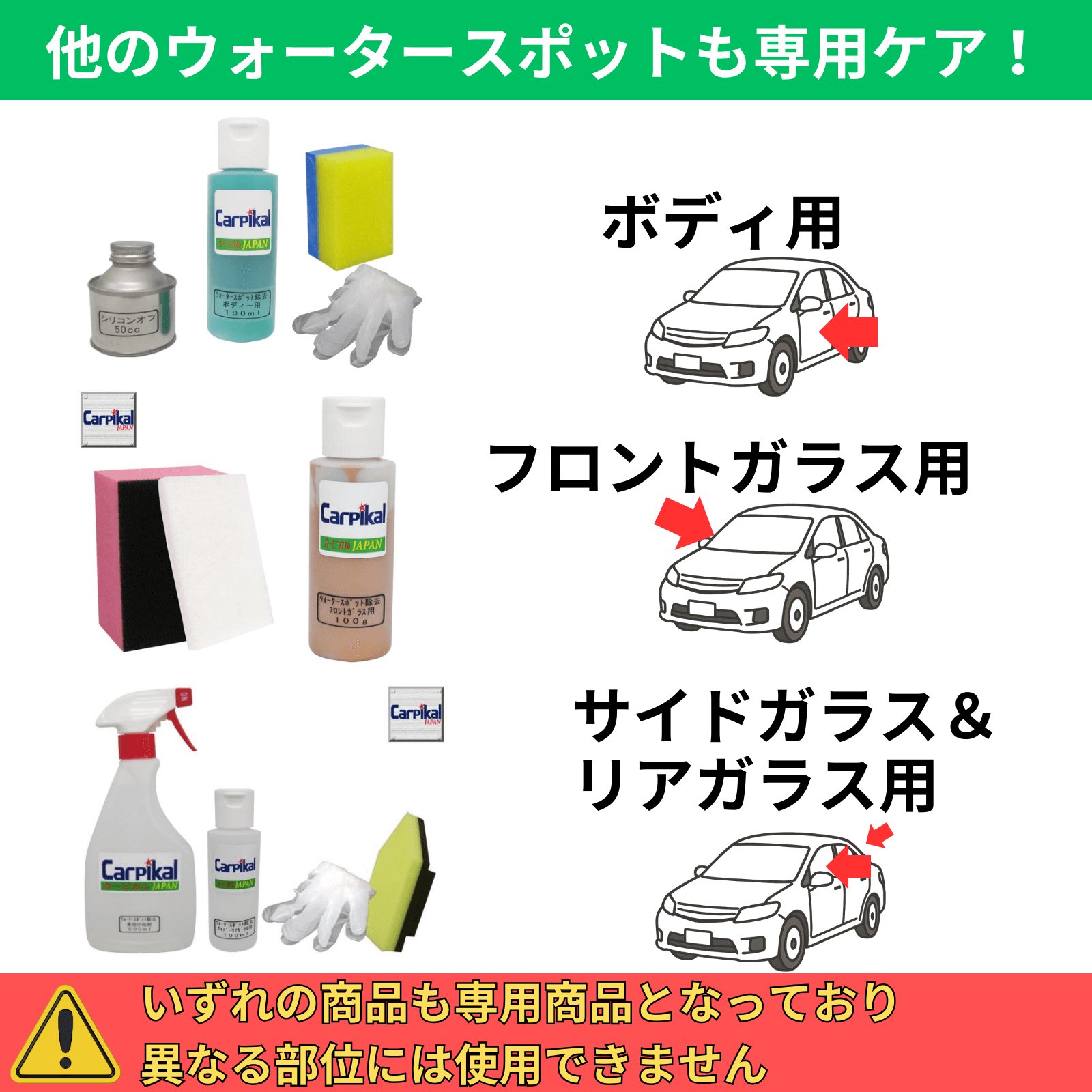外国車や特別な素材などでは目立たない所で試してからご使用下さい。