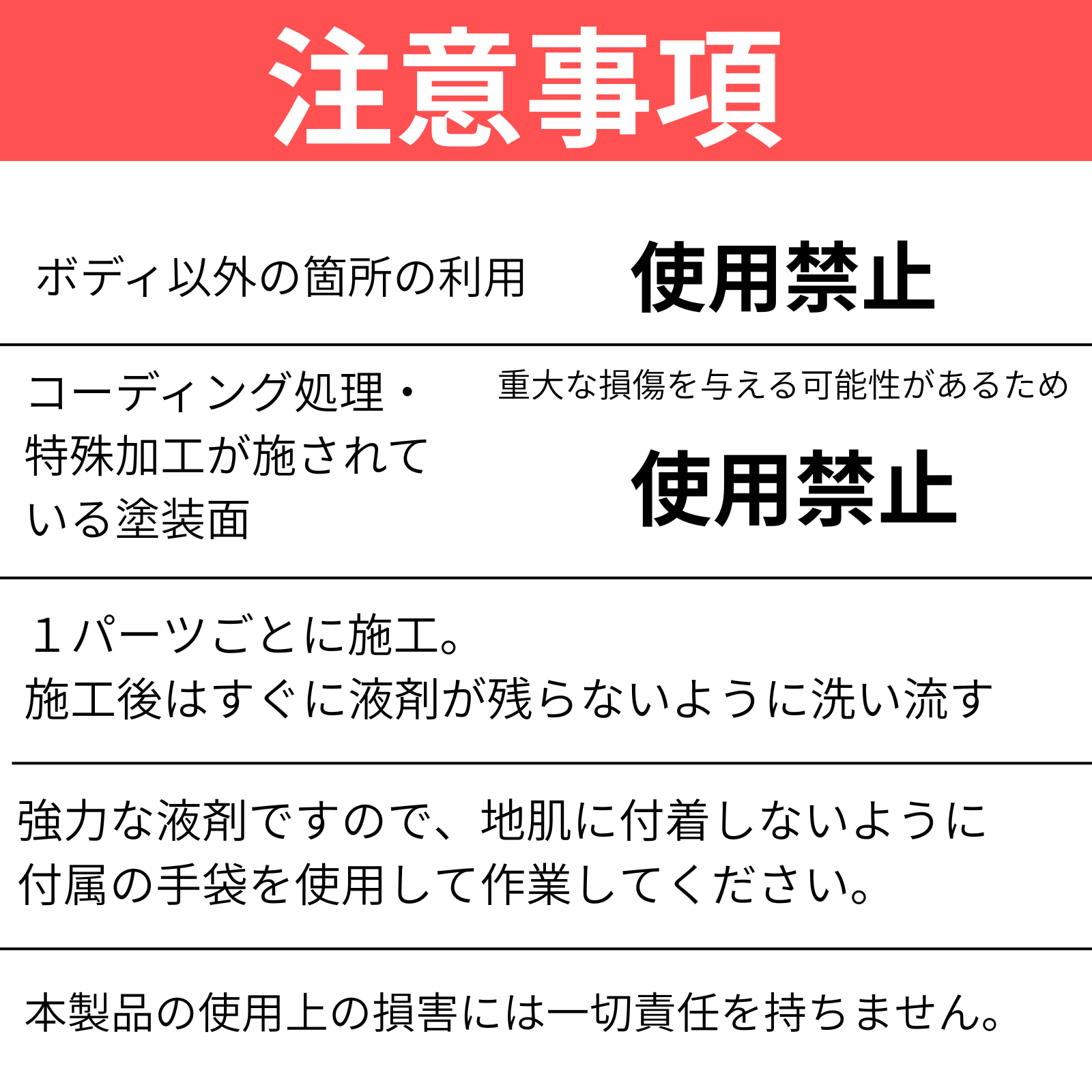 ◎ ボディー専用ですので、ゴムモールやメッキ部分等ボディー以外の場所に使用しないでください。
