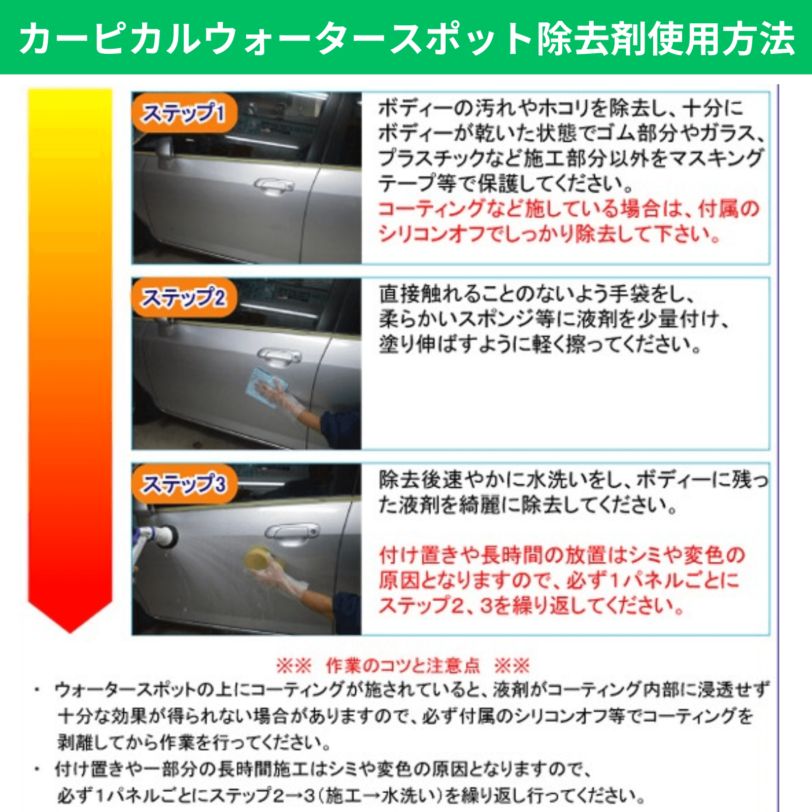 ご参考までに私の会社では、予めウォータースポットの上に残ったWAXなどの油分をシリコンオフやコンパウンドによる簡易研磨で除去し、本商品を使用しております。